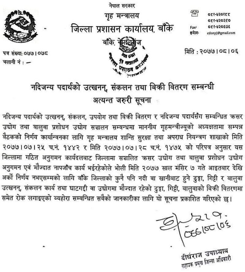 बाँकेमा हालै मात्र गठित अनुगमन समितिले राष्ट्रिय गौरबका योजनाको नाममा भन्दै मापदण्ड नपुगेका अधिकांश सबै क्रसर उद्योगलाई नदीजन्य पदार्थ बिक्री गर्नको लागि मौखिक आदेश दिएको छ भने बाँके प्रशासनले जारी गरेको सूचनाका अनुसार जनता र पत्रकार अहिले अन्यौलमा परेका छन् ।