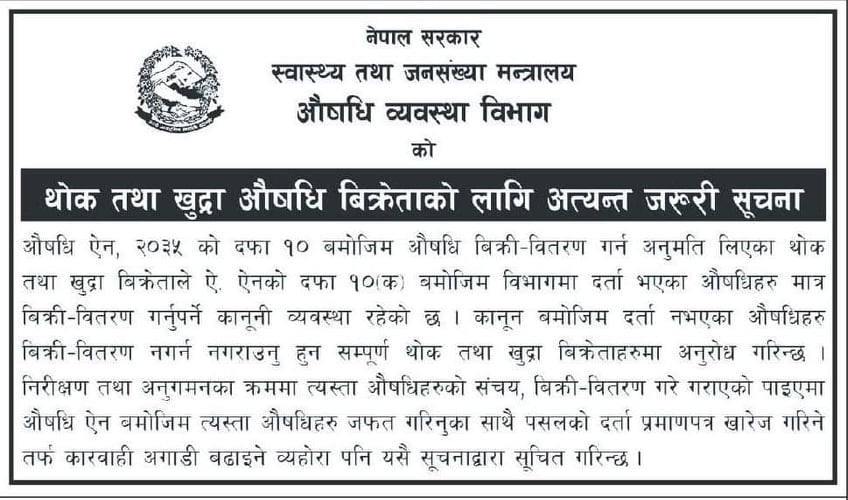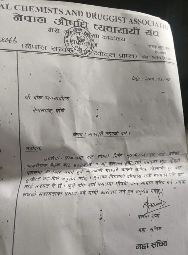 मेडिकल स्टोरबाट औषधी व्यवस्था विभागमा दर्ता नभएका कुनै पनि प्रोडक्ट बिक्री वितरण नगर्ने भनी नेपाल औषधी व्यवसायी संघ भेरी अञ्चल शाखा कार्यालयले समेत जानकारी गराई सबै मेडिकल स्टोरमा पत्राचार गरीसकेको भएपनि खुलेआम रुपमा नेपालगन्जस्थित अधिकांश मेडिकल स्टोरले मेडिकल स्टोरबाट अवैध रुपमा फुड प्रोडक्ट बिक्री वितरण गरेको पाइएको छ । नेपालगन्ज न्यूरोड स्थित औषधी व्यवस्था विभागमा दर्ता भएको एक फर्माले भर्खरै विल काटेर फुड प्रोडक्ट बिक्री गरेको प्रमाण ध्वनिखबर डटकममा सुरक्षित राखिएको छ ।
