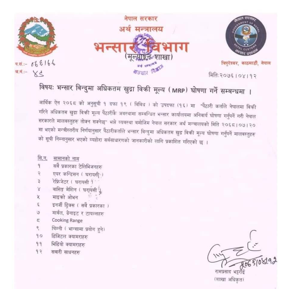 यता भन्सार विभागले सबै भन्सार कार्यालयलाई भन्सार विन्दुमा अधिकतम खुद्रा बिक्री मूल्य घोषणा गर्ने विषयमा पत्राचार गर्दा पनि नेपालगन्ज भन्सार कार्यालय नाका हुँदै आयात हुने फुड प्रोडक्ट न्यूट्राको के कतिमा मूल्यांकन हुन्छ भन्ने विषयमा नेपालगन्ज भन्सार कार्यालयले मूल्यांकन देखाउन भने आलटाल गर्दा आशंका उत्पन्न हुन थालेको छ । न्यूट्राका व्यवसायीहरुले अधिकतम खुद्रा मूल्य आयात भई आएपछि आफैले नै प्रिन्ट गर्ने भएपछि मूल्यमा धेरै नै फरक पारी बिक्री हुने तथा विरामी ठगिएको भन्ने केहीले आरोप समेत लगाएको ध्वाइस रिकर्ड पनि सुरक्षित राखिएको छ । नेपालगन्ज भन्सार कार्यालय लगायत अन्य नाकाबाट आयात हुने यस्ता न्यूट्राका प्रोडक्टको विषयमा बजारमा उपलब्ध भएका प्रोडक्ट र भन्सारको मूल्यांकनबिचको अन्तर विषयमा सुक्ष्म छानबिन गर्दा ठगी गर्ने गिरोहको पर्दाफास हुने कुरामा केही औषधी बिक्रेताहरु एक मत देखिएका छन् ।