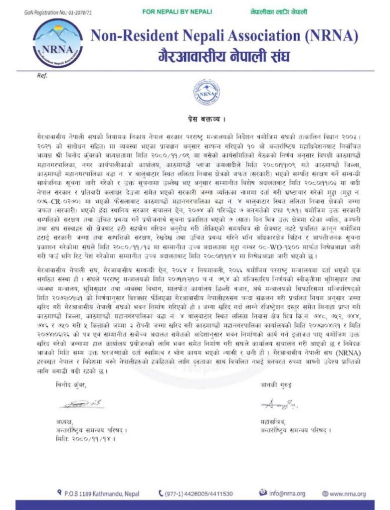 यसैबीच एनआरएनएका अध्यक्ष विनोद कुँवर र महासचिव जानकी गुरुङले विज्ञप्ती जारी गरेर संघको सम्बन्धी ऐनअनुसार सरकारको निर्णय विश्वभर फैलिएका गैर आवसीय नेपालीहरुसँग चन्दा संकलन गरी उक्त जग्गा खरिद गरी भवन निर्माण गरेको बताएका छन् ।