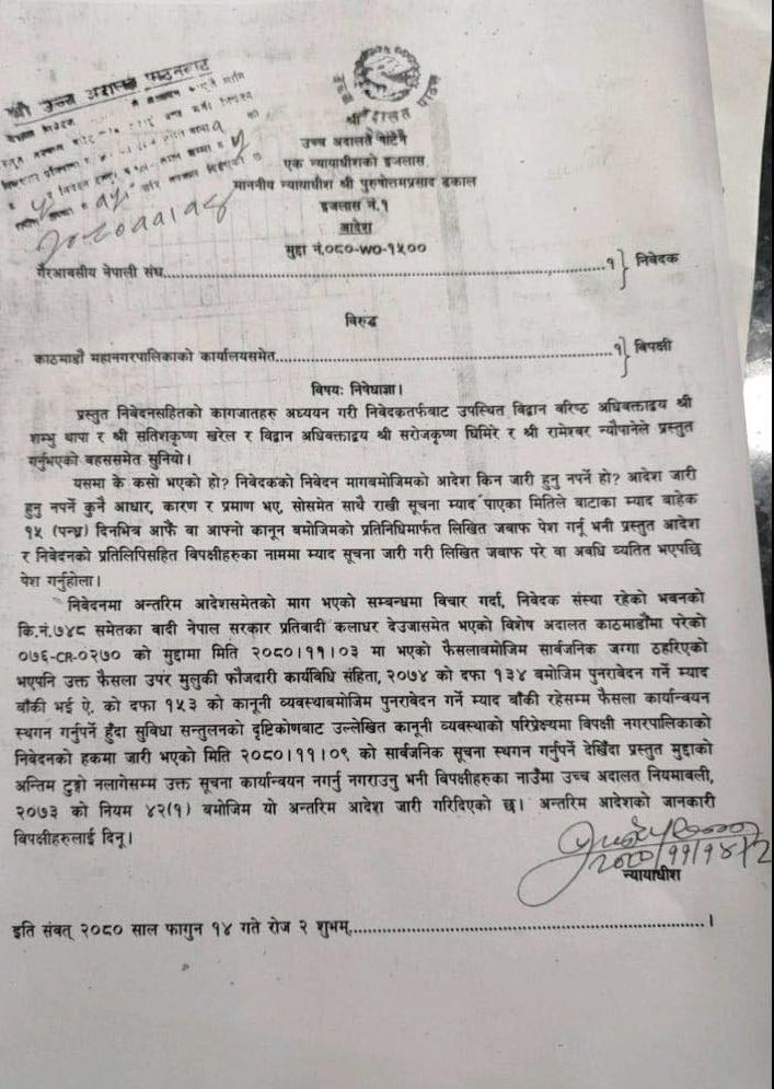 काठमाडौं, १५ फागुन । गैर आवासीय नेपाली संघको कार्यालय तत्काल खाली नगराउन उच्च अदालत पाटनले काठमाडौं महानगरपालिकाको नाममा अन्तरिम आदेश जारी भएपछि नगरप्रहरीको डोजरको हावा फुस्स भएको छ ।्