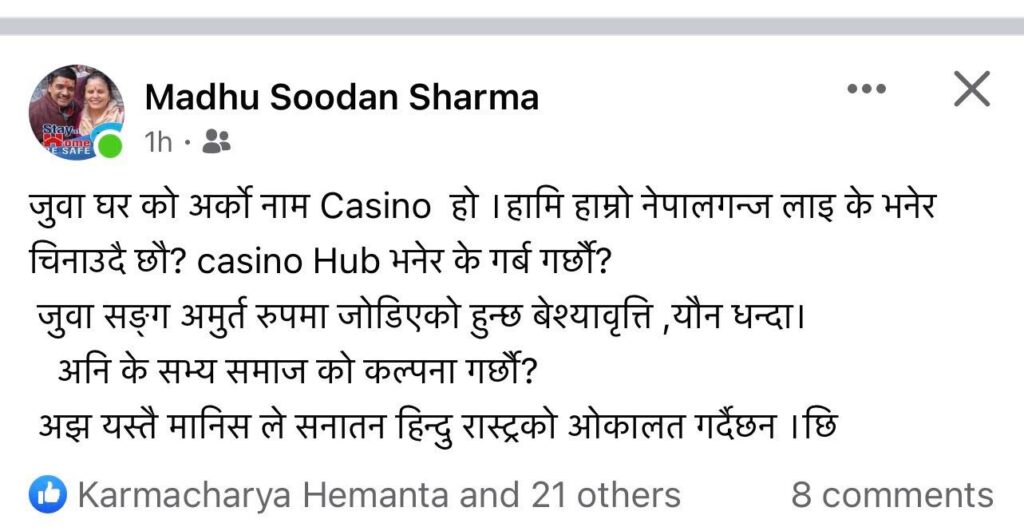 बाँकेका बुद्धिजीवि एवम् बाँके एमालेका बरिष्ठ नेता मधुसुदन शर्माले नेपालगन्ज सहरलाई ‘क्यासिनो हब’ भनेर गर्व गर्ने नेपालगन्ज उपमहानगरपालिकालाई कटाक्ष मार्दै क्यासिनो भनेको बेश्यावृत्ति तथा यौन धन्दाको केन्द्र भन्दै कटाक्ष हान्दै सामाजिक संजालमा टिकाटिप्पणी गरेका छन् ।
