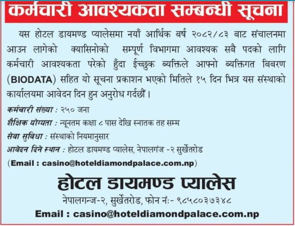 डायमण्ड प्यालेस होटलले क्यासिनोको लागि कर्मचारी आवश्यकता भनी सूचना जारी गरेपछि क्यासिनो खोल्ने अनुमतिको विषयमा जानकारी लिने क्रममा पर्यटन विभाग काठमाडौंका सूचना अधिकारी लिलाधर अवस्थी भन्नुहुन्छ–‘डायमण्ड प्यालेस होटलले ४ वा ५ तारे होटलको अनुमति लिएको विभागमा कुनै रिकर्ड छैन र देखिदैन । ४ वा ५ तारे होटलको अनुमति बिना कुनै पनि क्यासिनो संचालन गर्न पाइदैन, यो गैर कानुनी हो । अनुमति बिना क्यासिनो संचालन गर्छ भने स्थानिय प्रशासनले कानुनी कारवाही गर्नु पर्छ ।’